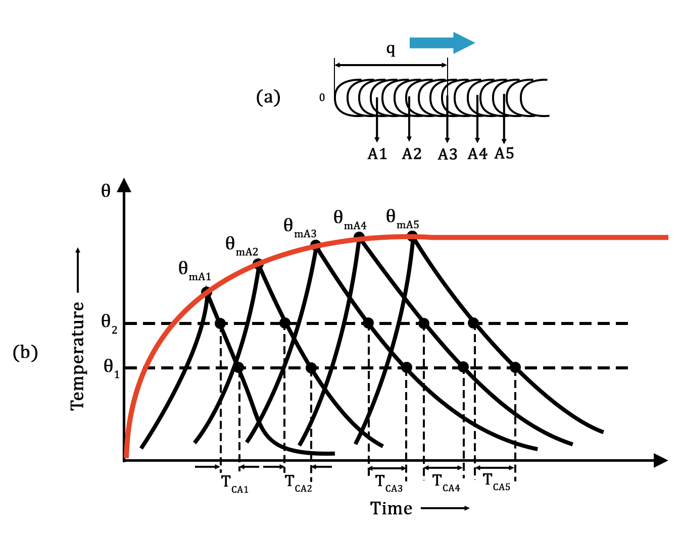 In order to find the thermal cycle undergone by a weld bead, experiment can be performed such that thermocouples are positioned along the weld path at various points. The thermocouples placed along the weld line in A1, A2, A3, A4, and A5 positions can be seen schematically in Figure 1a.