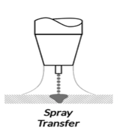 In this type of transfer, the electrode is held further away from the workpiece, and the filler metal forms into a spray of small droplets that transfer to the workpiece and form the weld. This type of transfer is typically used for high welding current and high welding speed applications and is known for its high heat input and high deposition rate and low spatter. It requires high energy and typically voltage > 25 volts, current >250amps.