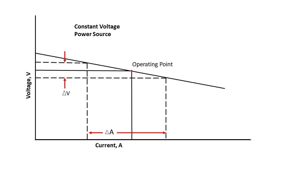 - Constant Voltage Power-source: Constant voltage (CV) power sources, also known as voltage-regulated power sources. The graph shows a horizontal line representing the constant voltage output of the power source. This line does not change much regardless of the current drawn from the power source, indicating that the voltage remains constant This type of power source is typically used for lighter gauge metals, and provides a consistent arc length and stability, making it ideal for welding aluminium and other non-ferrous metals.