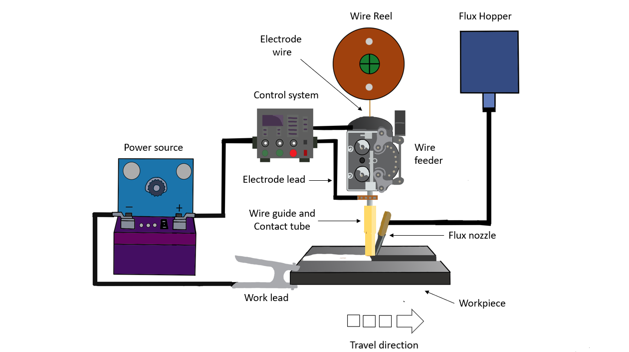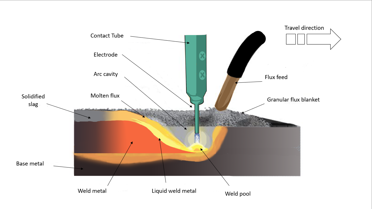 SAW works by creating an arc between the workpiece and the wire electrode. The wire electrode is fed constantly through a wire spool to the workpiece. Simultaneously, the arc and weld pool is protected from atmospheric contaminants by the slag, which forms by the melting of granular flux. The flux is a mixture of fine powders of materials such as silica, lime, alumina, etc. As the welding arc progresses, the flux surrounding the weld pool melts and flows over the weld pool. The molten flux (slag) protects the weld, retains the heat, and prevents spatter. Later, the molten flux cools and solidifies into a layer of slag that is easily removed after welding. Fig.2 below depicts the cross-sectional view of the workpiece during welding, showing the molten flux, slag, weld pool, etc.
