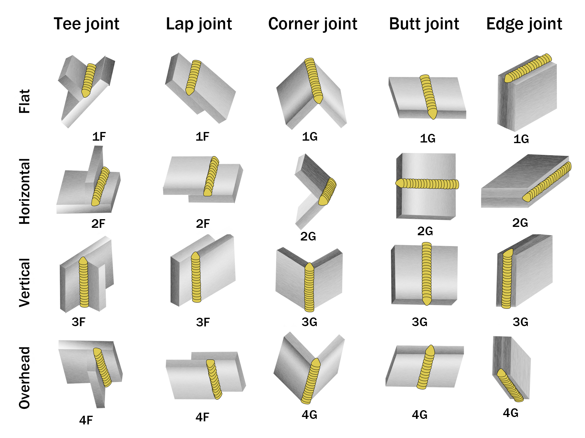 Figure 12: Schematic of the welding positions (rows) with respect to joint types (column)
