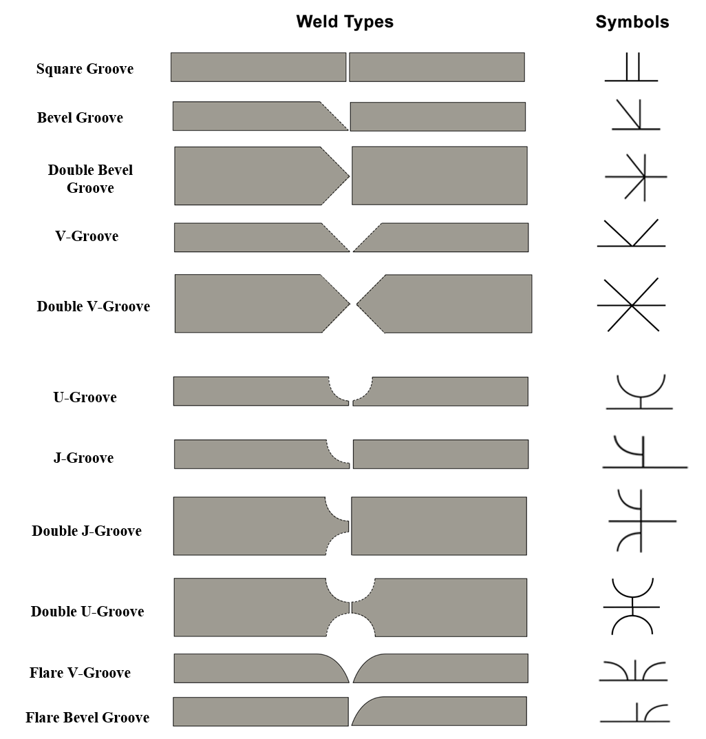 Figure 14: Schematic representation of various groove weld types and its symbols.