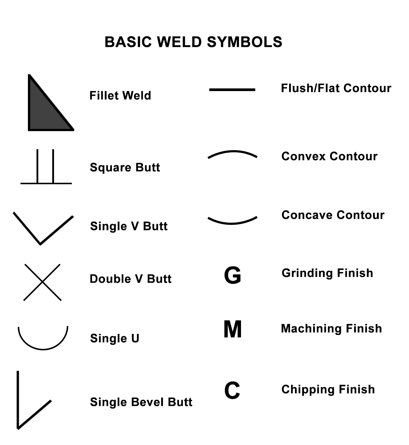 The basic weld symbols consist of the type of weld, the contour of the weld (convex , concave and flat) , and the type of finish (grinding, michining or chipping). Figure 14 illustrates some of the elements of the basic welding processes.