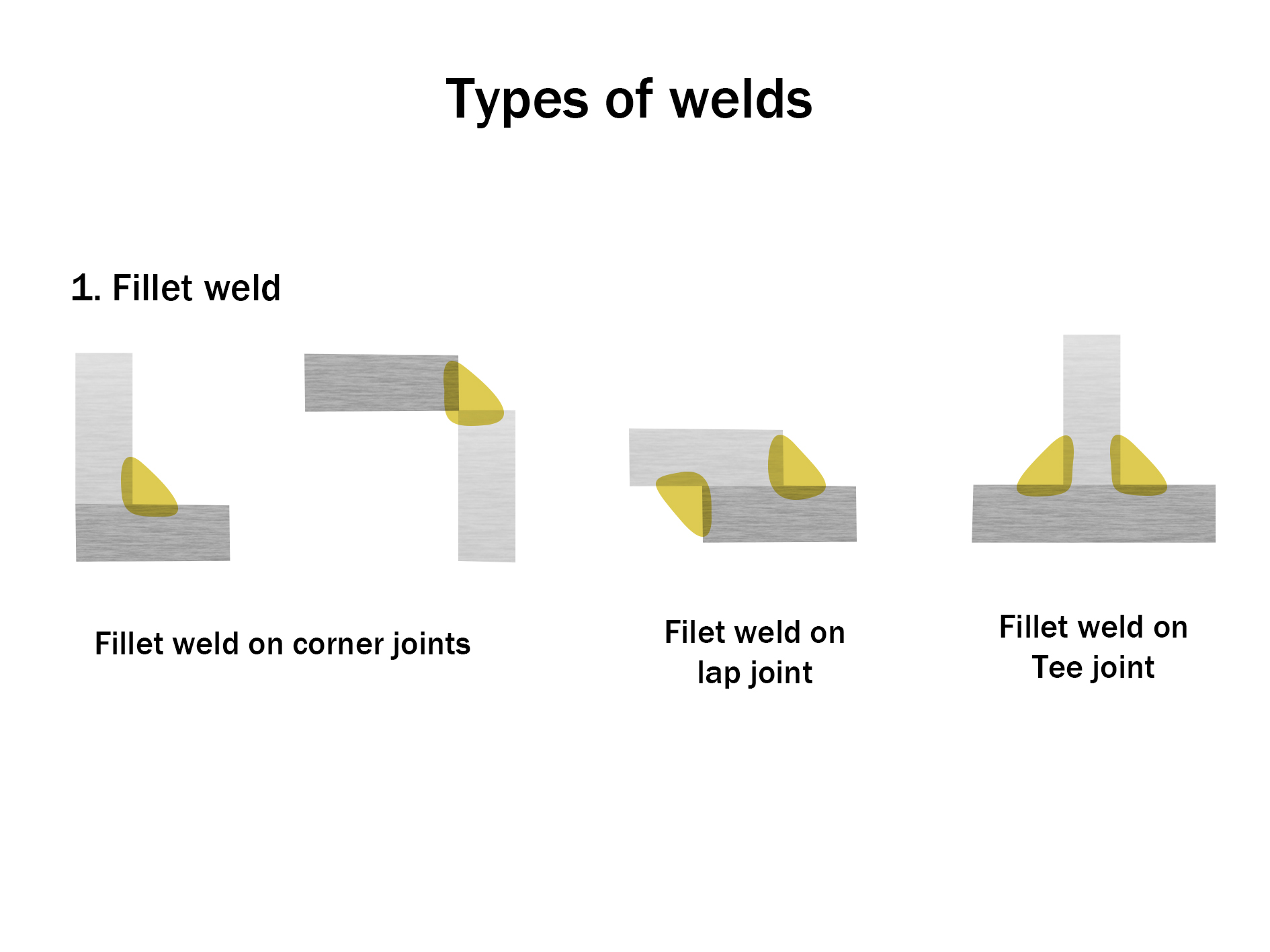 Mainly three different types of welding are used i.e. fillet weld, groove weld and surface weld.