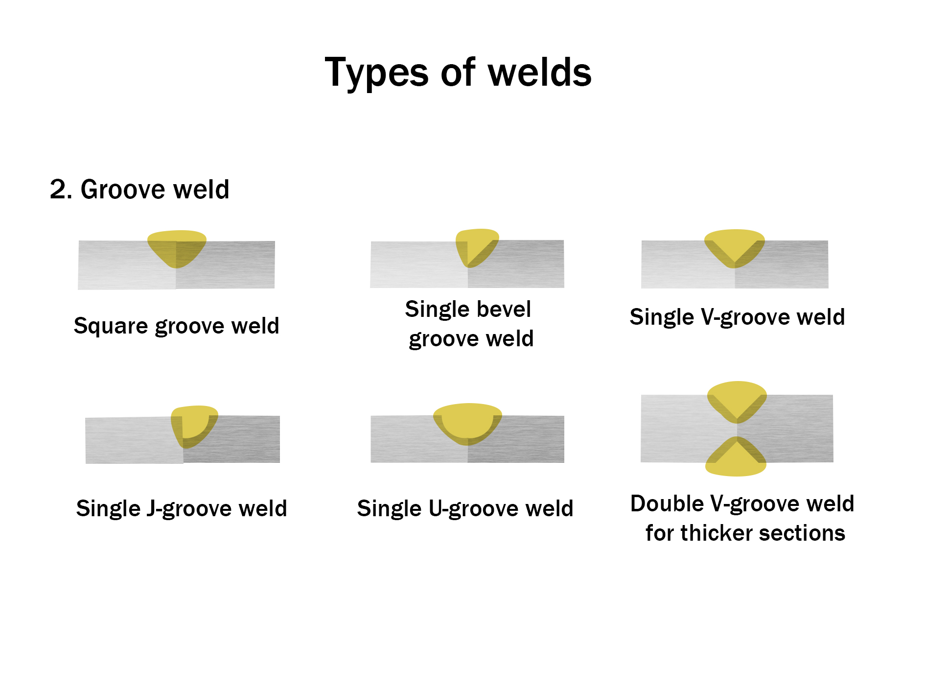 After the fillet weld, they are the 2nd most popular weld choice. It is used in various joints of various types of groove welds determined by the edge preparation can be seen below. The most economical is the square groove welds.