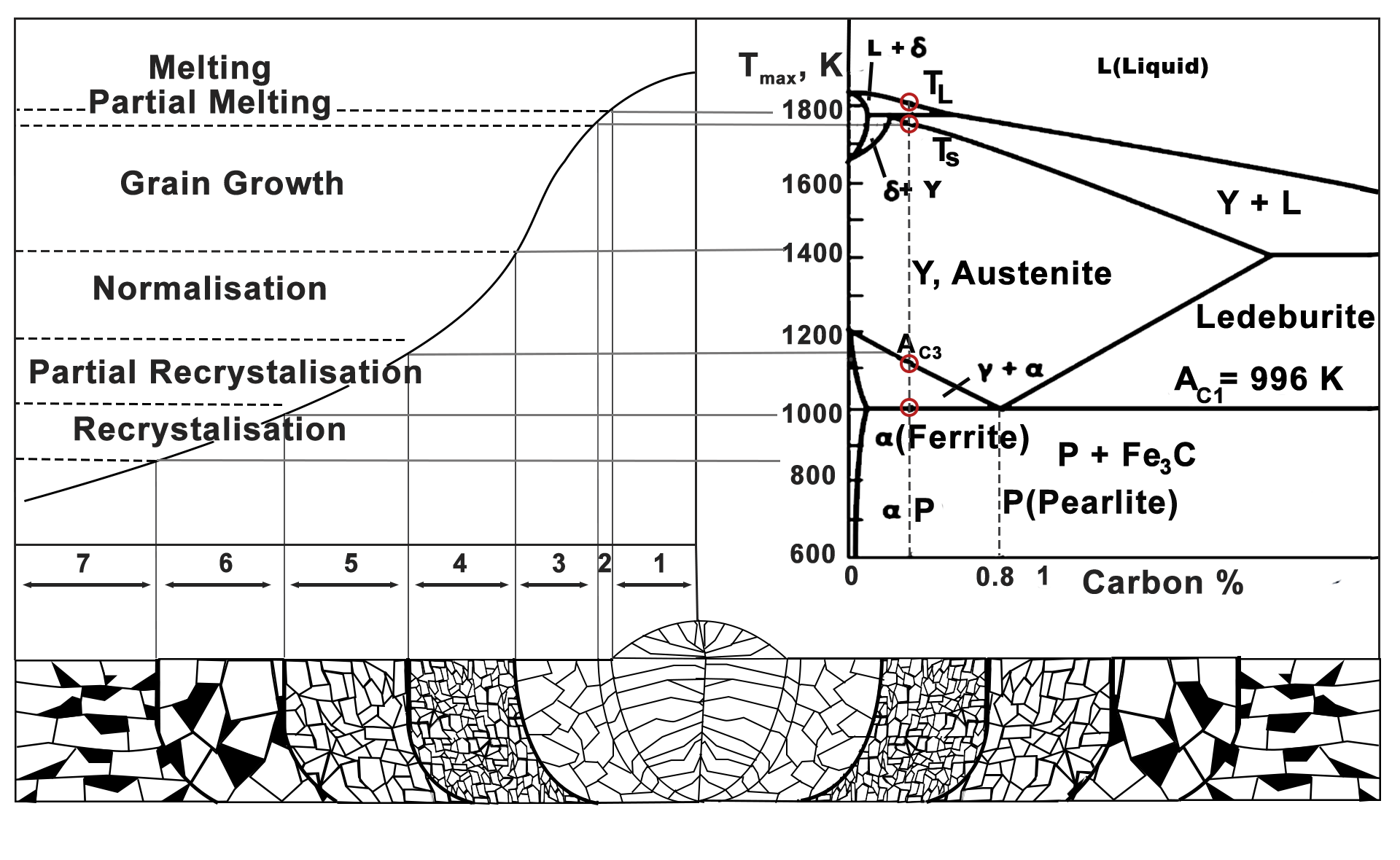 Zone 6: Recrystallisation - In this zone, the microstructure remains unchanged (Tmax< AC1) if the metal was annealed condition before welding. The recrystallization process will occur if metal was work hardened by bending or cold rolling. The minimum temperature required for recrystallization for pure metals is 0.4Tm, where Tm is the temperature required for melting in (K). In welded joints, area heated above 800K undergo recrystallization.